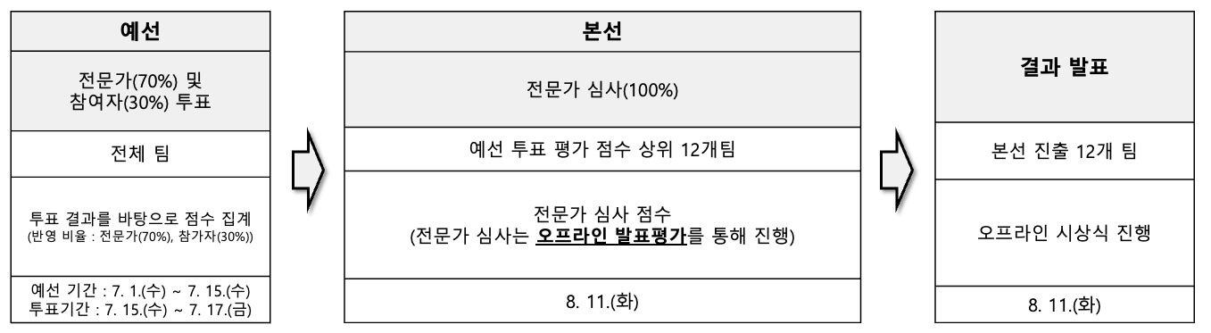 ※ 예선 종료 후, 전문가(70%) 및 참여자(30%)의 투표 평가 진행 (7. 15(수) 10:00 ~ 7. 17(금) 10:00)